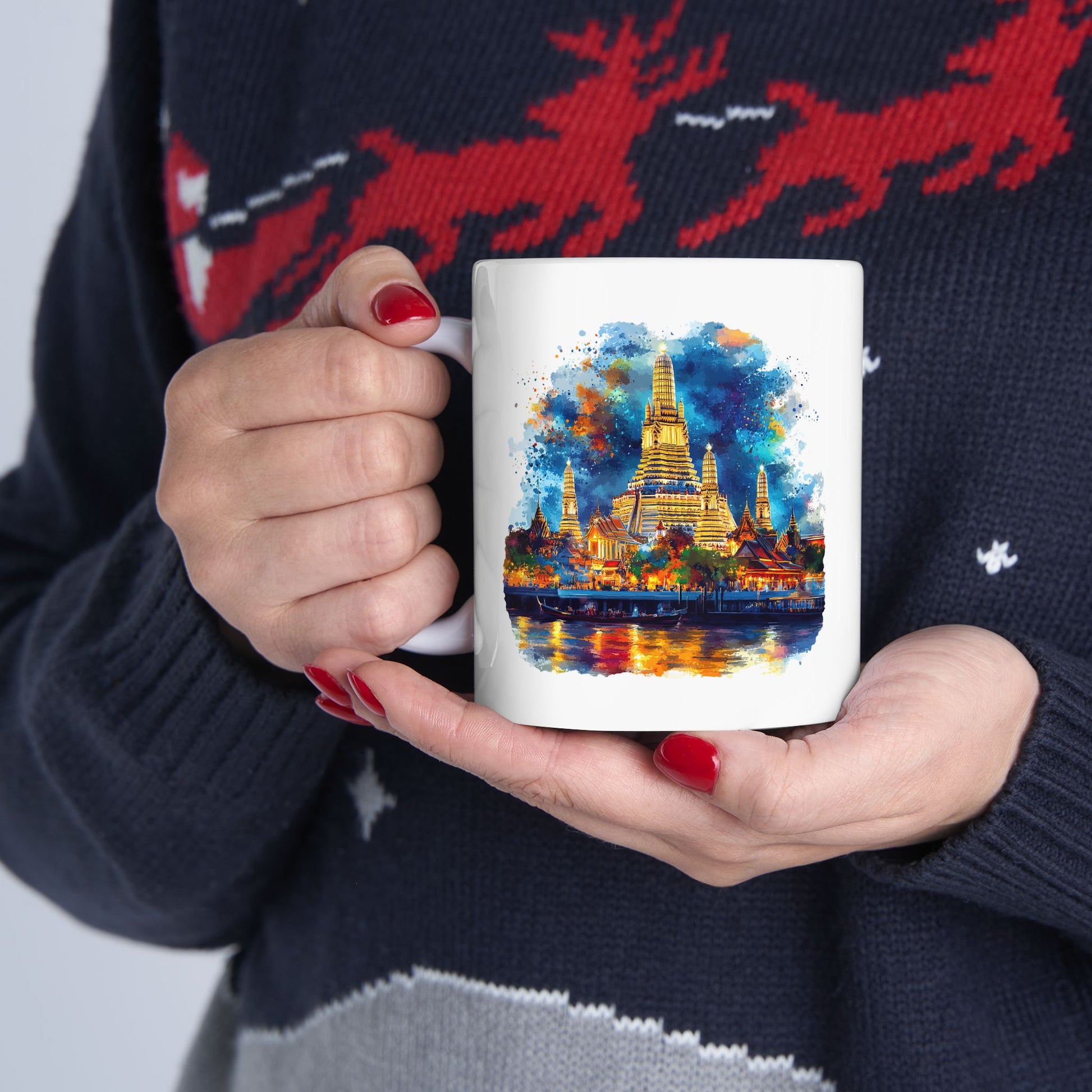 Bring the serene beauty of Bangkok's legendary Wat Arun Temple into your daily ritual with this stunning watercolour design mug. Each sip becomes a moment of tranquility, inspired by the elegant spires and radiant hues of the "Temple of Dawn" captured in soft, artistic washes of colour. More than just a mug, it's a portable masterpiece—a gentle reminder of faraway wonders, perfectly rendered on high-quality ceramic. Whether cradling your morning coffee or gracing your shelf as a decorative treasure, this mug infuses your everyday with a touch of hand-painted artistry and timeless Thai charm.