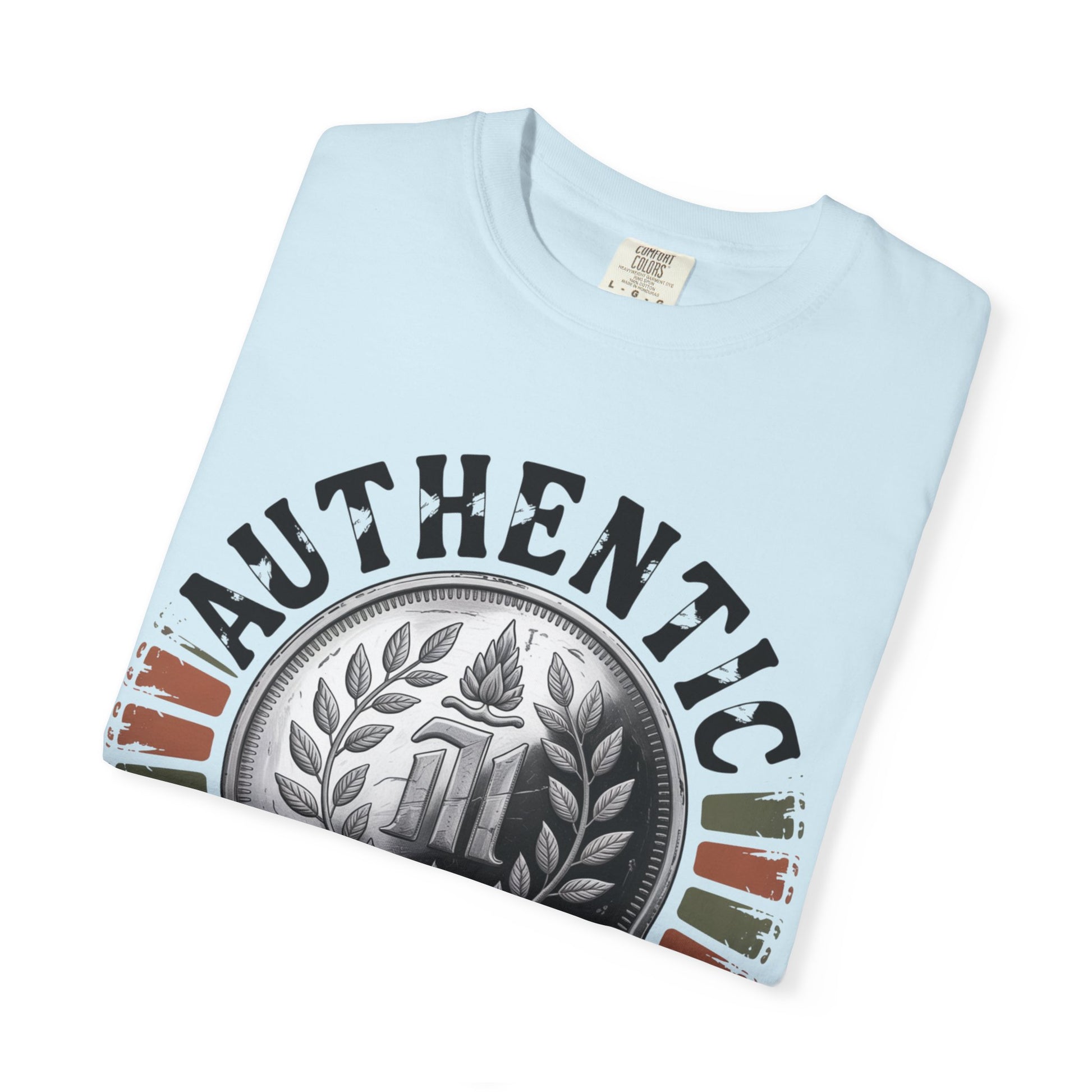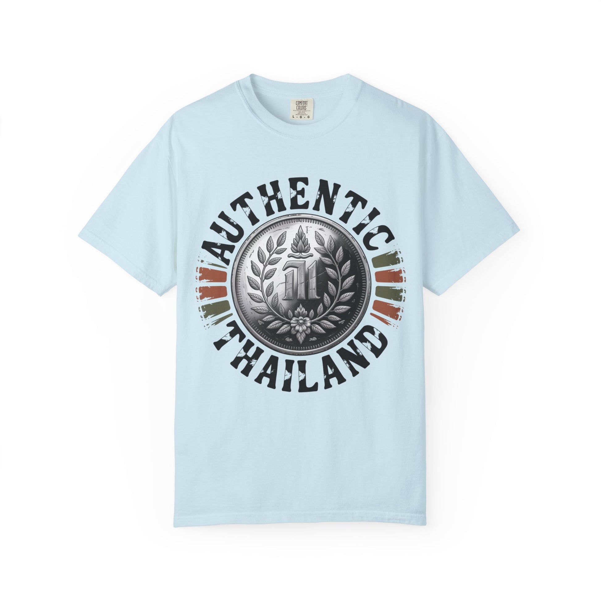 This heavyweight, garment-dyed T-shirt draws inspiration from classic Thai coinage and heritage emblems, featuring a detailed vintage-style medallion at its center. The circular design, surrounded by distressed typography reading “Authentic Thailand,” gives the artwork an old-world, collectible feel—like a keepsake discovered on a meaningful journey. Subtle earthy accents add depth without distracting from the strong central emblem.