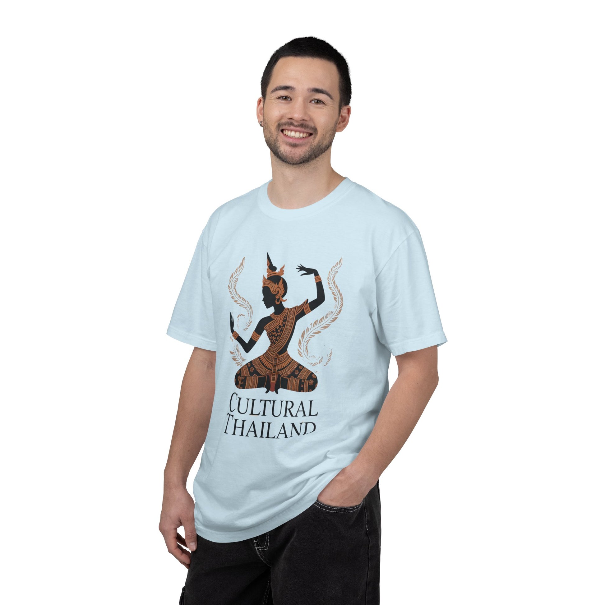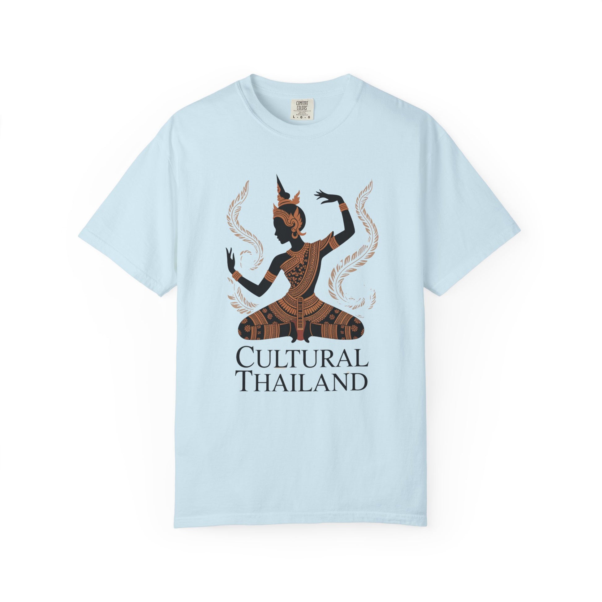 This heavyweight, garment-dyed T-shirt highlights the elegance of Thai classical dance through a refined, ornamental illustration inspired by traditional Thai art. The design features a graceful dancer silhouette adorned with intricate costume details and flowing decorative elements, rendered in warm gold and earth tones against a deep background. It feels ceremonial, timeless, and deeply connected to Thailand’s artistic heritage.
