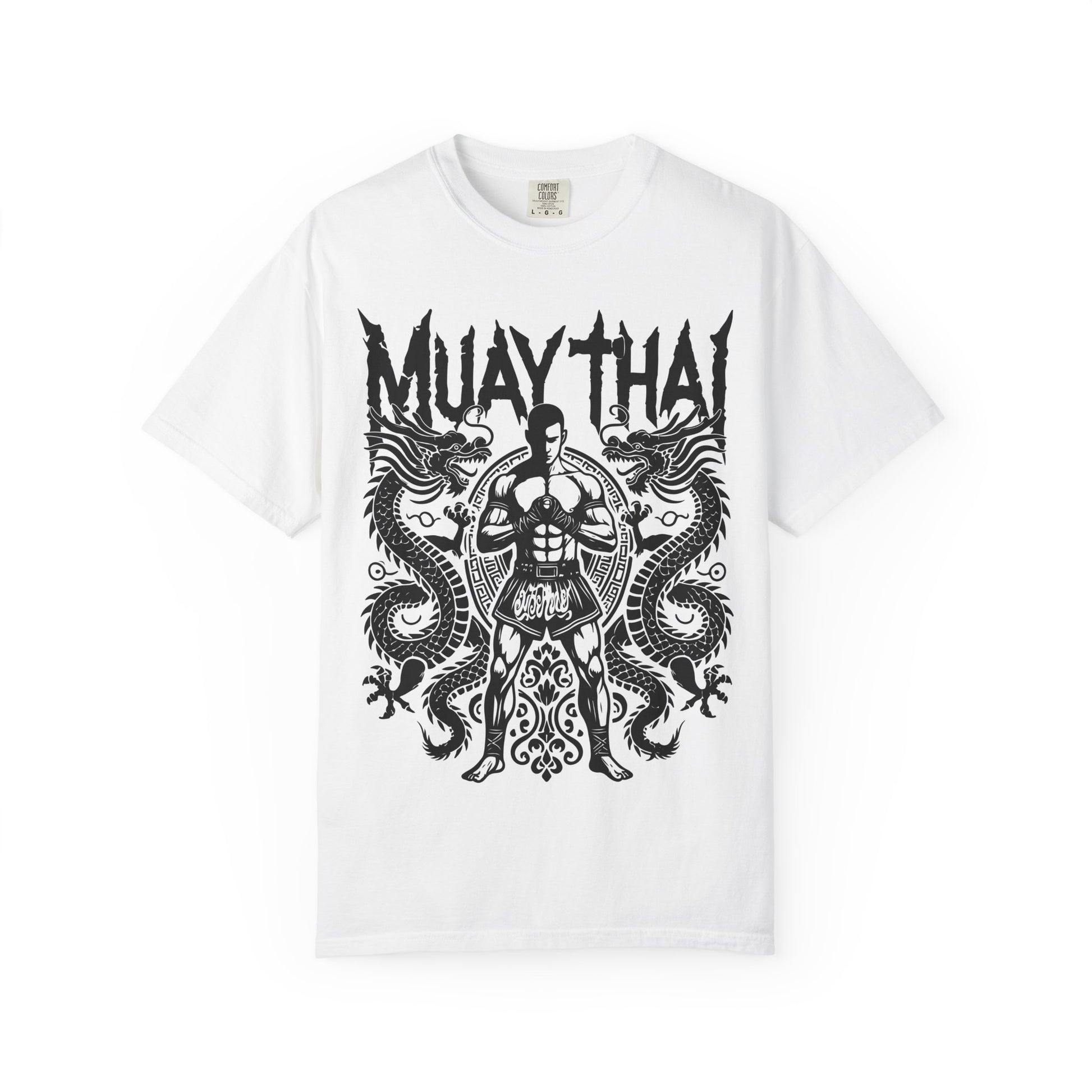 A powerful Muay Thai illustration featuring a focused fighter framed by twin dragons. Built for those who respect discipline, tradition, and the art of striking.