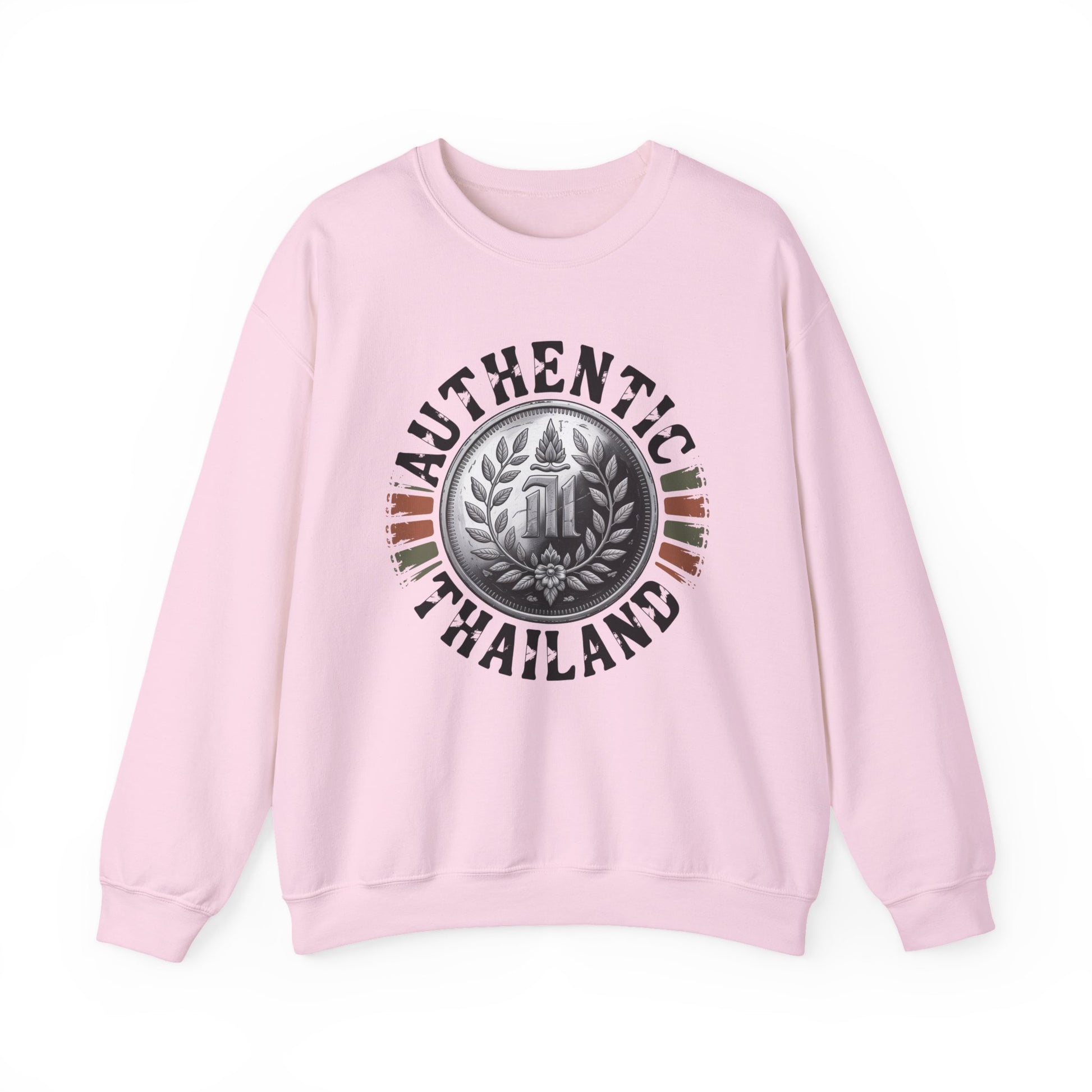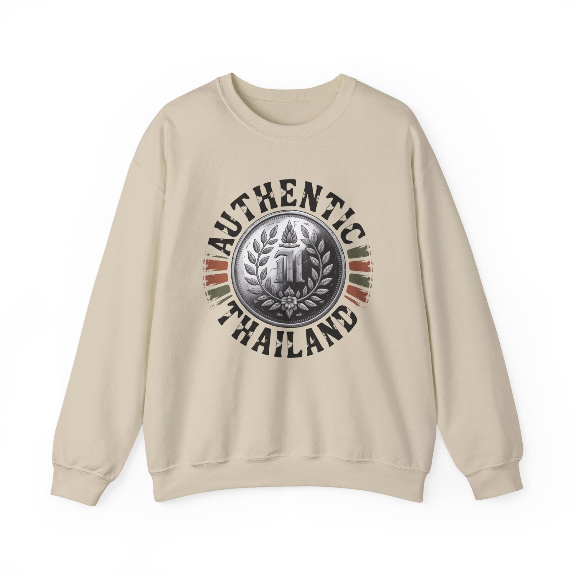 A soft, cozy crewneck designed to honor Thailand’s heritage with a refined, vintage feel. This medium-weight sweatshirt features an antique-style coin emblem centered with a detailed wreath and classic Thai-inspired symbol, framed by distressed “Authentic Thailand” lettering. Subtle earthy accent strokes add depth without overpowering the design, giving it a timeless, well-traveled look. Comfortable yet distinctive, it’s made for everyday wear — perfect for relaxed weekends, travel days, or cool evenings when you want comfort with cultural character.