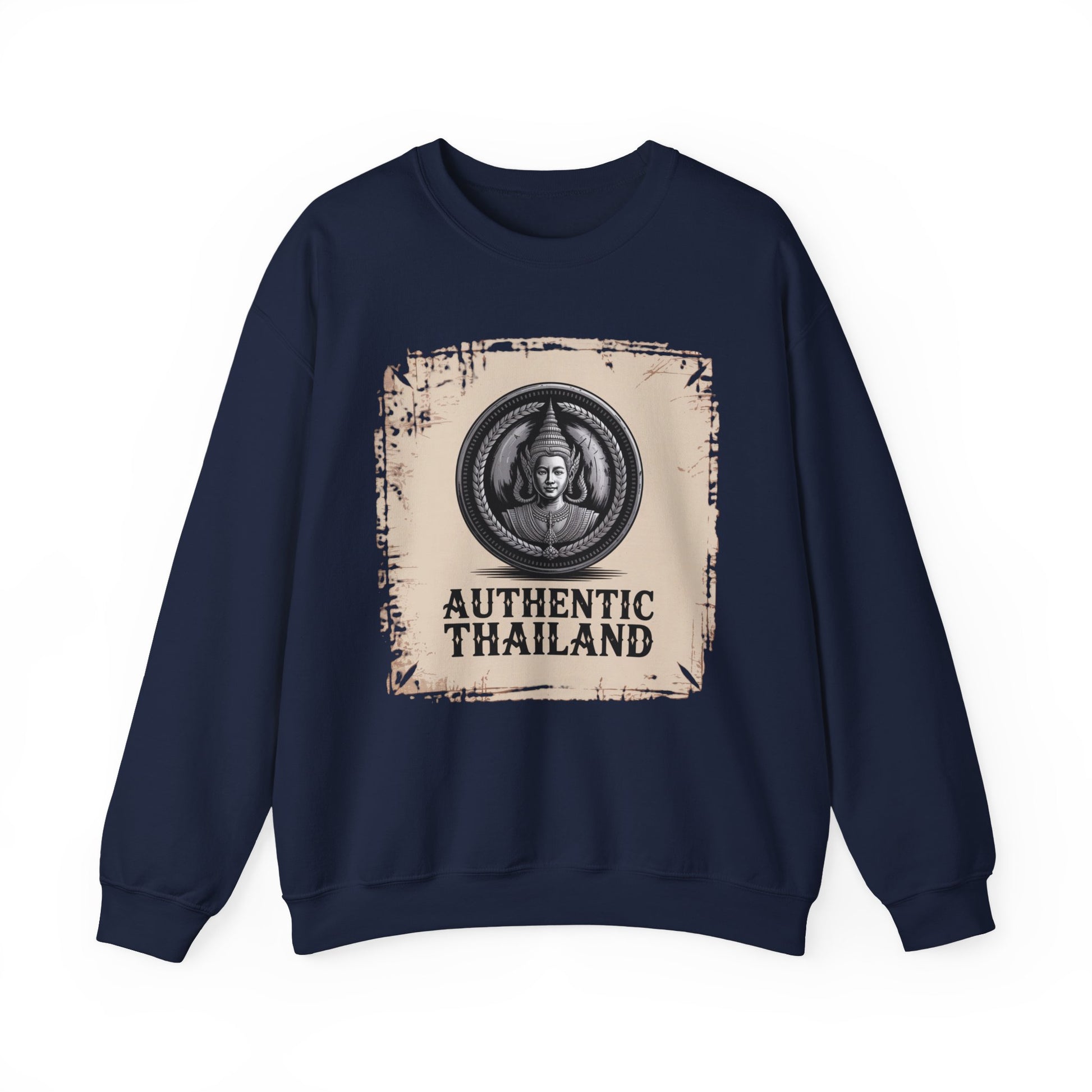 A soft, cozy crewneck that carries the weight of history and craftsmanship. This medium-weight sweatshirt features a detailed vintage coin-style illustration inspired by traditional Thai artistry, framed with laurel elements and set against a distressed parchment-style backdrop. The bold “Authentic Thailand” typography grounds the design, giving it a timeless, archival feel. Comfortable enough for everyday wear yet visually rich, it’s perfect for travel lovers, culture enthusiasts, or anyone who appreciates heritage-inspired design with a calm, confident presence.