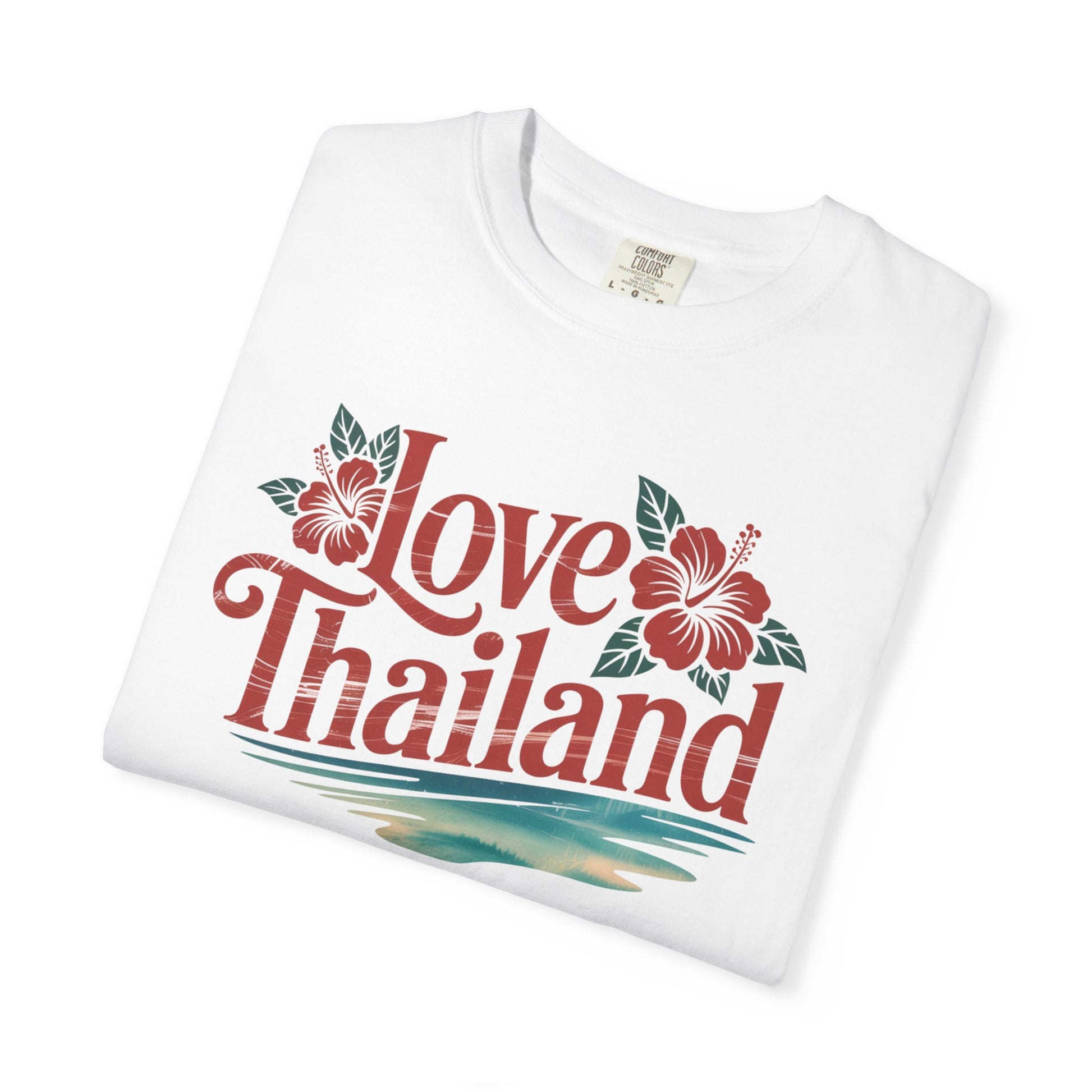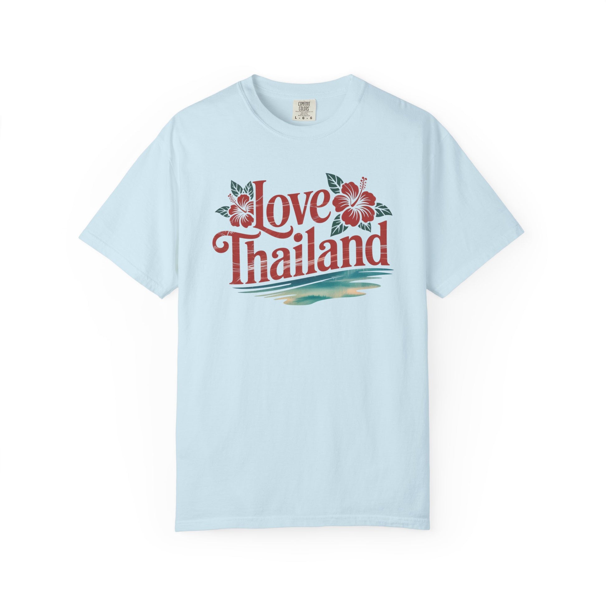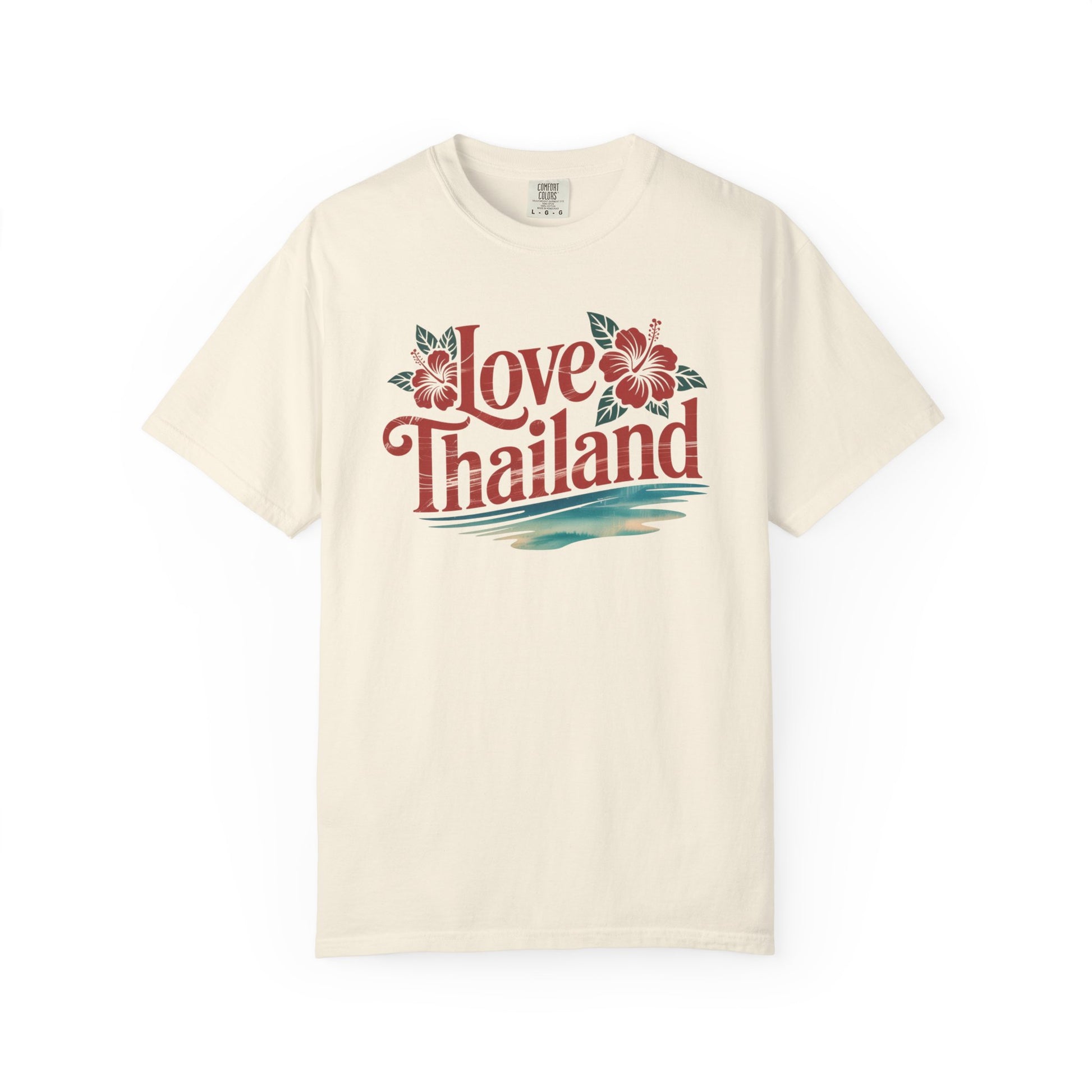 Soft, lived-in cotton with a vintage island vibe. This relaxed tee carries a warm, sun-bleached look from garment-dyeing and features a hand-drawn “Love Thailand” motif framed by tropical blooms and a soft sea horizon. Wear it on slow mornings at the beach, wandering night markets, or layered under a light jacket while swapping travel stories. The texture is slightly broken-in from the dye process, so the print feels like a memory, not a billboard — comfortable, calming, and quietly personal.