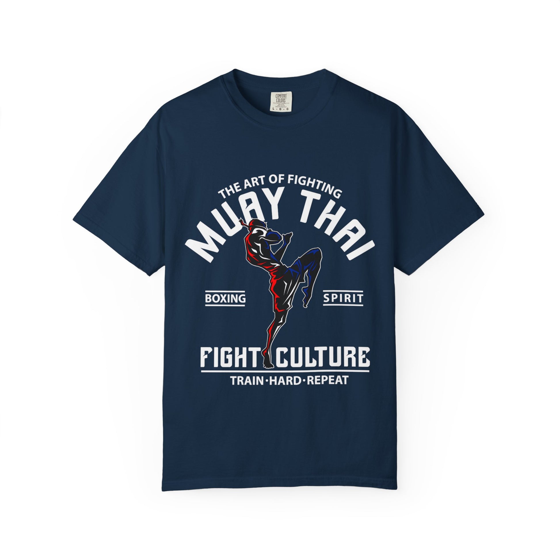 This heavyweight, garment-dyed T-shirt captures the raw power and discipline of Muay Thai through a bold, minimal illustration. The striking silhouette of a fighter mid-kick uses sharp red and deep blue highlights against a clean form, creating a sense of motion, strength, and focus. It feels like a tribute to the art of combat—precise, controlled, and unapologetically intense.