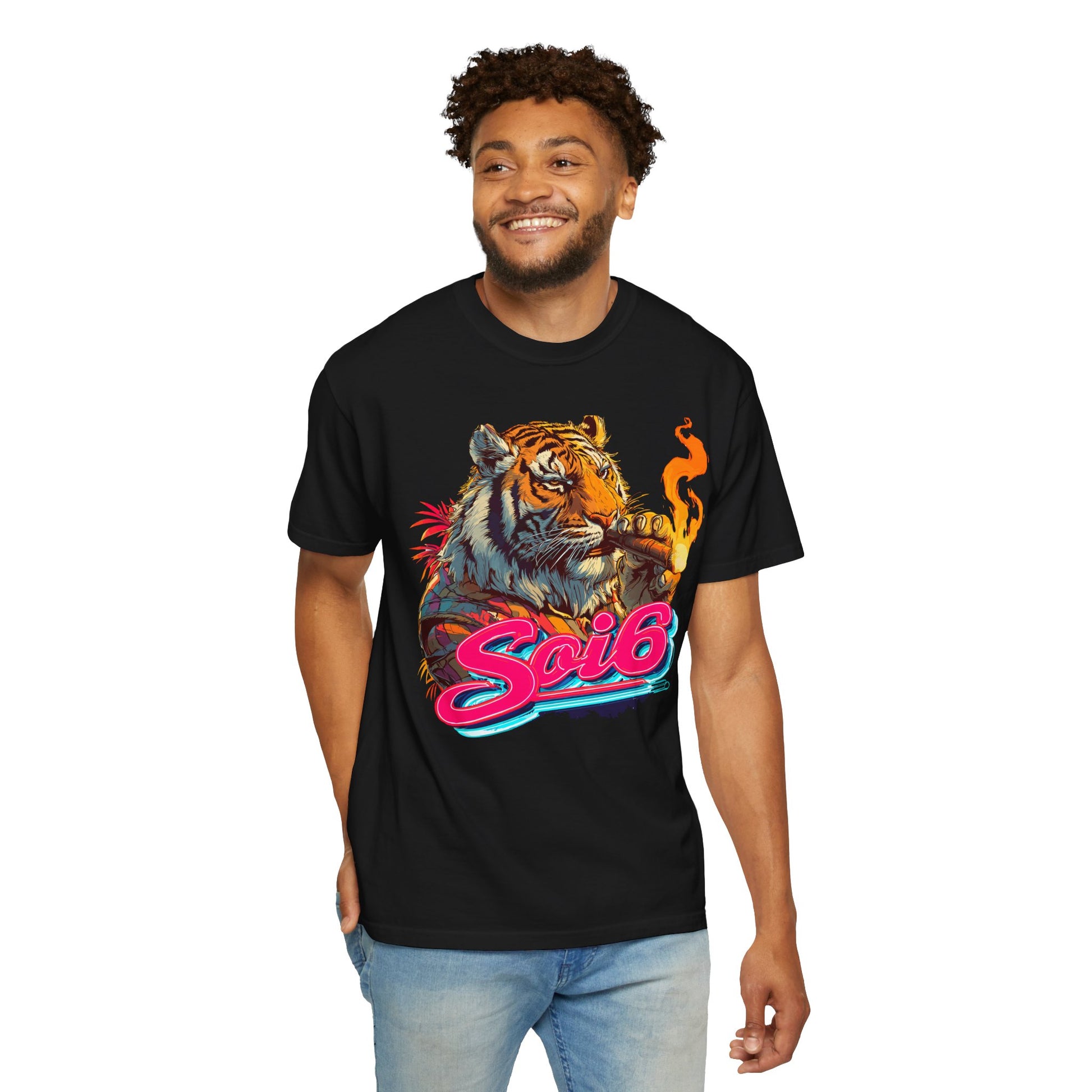 This heavyweight, garment-dyed T‑shirt carries a bold retro tiger smoking graphic that feels like a snapshot from a smoky 1970s poster. The soft, lived-in dye and relaxed cut invite you to slide it on for late-night drives, record-store dives, or alleyway conversations. The tiger’s slow, knowing stare and curl of smoke give the shirt an ironic, rebellious edge—wear it when you want to signal that you appreciate vintage attitude and a little tasteful danger. It sits comfortably on the body thanks to a relaxed fit and substantial cotton weight, and the tubular, seam-free construction keeps the silhouette clean so the graphic stays front-and-center. Thoughtful details—like double-needle stitched seams and a sewn‑in label—mean this tee will live in your rotation for years, gaining character with every wash.